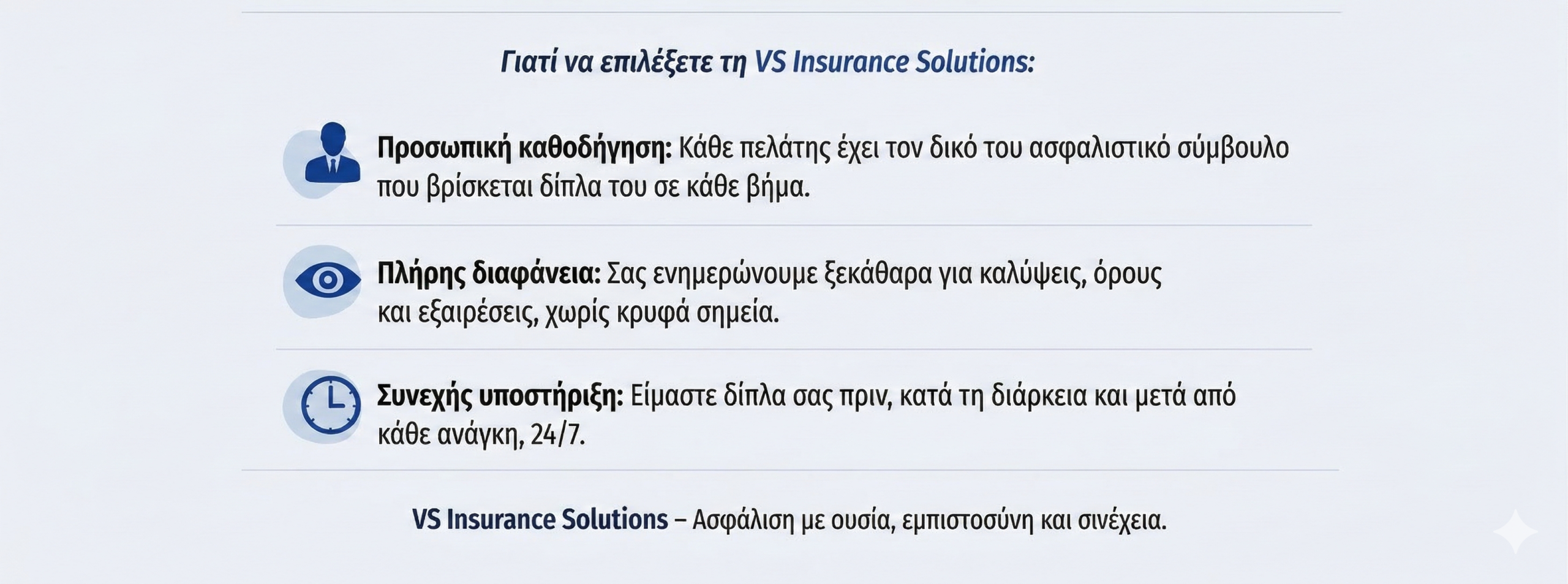 Στη VS Insurance Solutions πιστεύουμε ότι όταν πρόκειται για την προστασία της ζωής σας, της οικογένειας και της περιουσίας σας, καθοριστικό ρόλο δεν παίζει μόνο το ασφαλιστήριο συμβόλαιο ή η ασφαλιστική εταιρεία, αλλά κυρίως ο ασφαλιστικός σύμβουλος που βρίσκεται δίπλα σας. Ο άνθρωπος που θα σας καθοδηγήσει υπεύθυνα, θα σας εξηγήσει με σαφήνεια τις επιλογές σας και θα σταθεί δίπλα σας σε κάθε στάδιο της ασφαλιστικής σας πορείας.